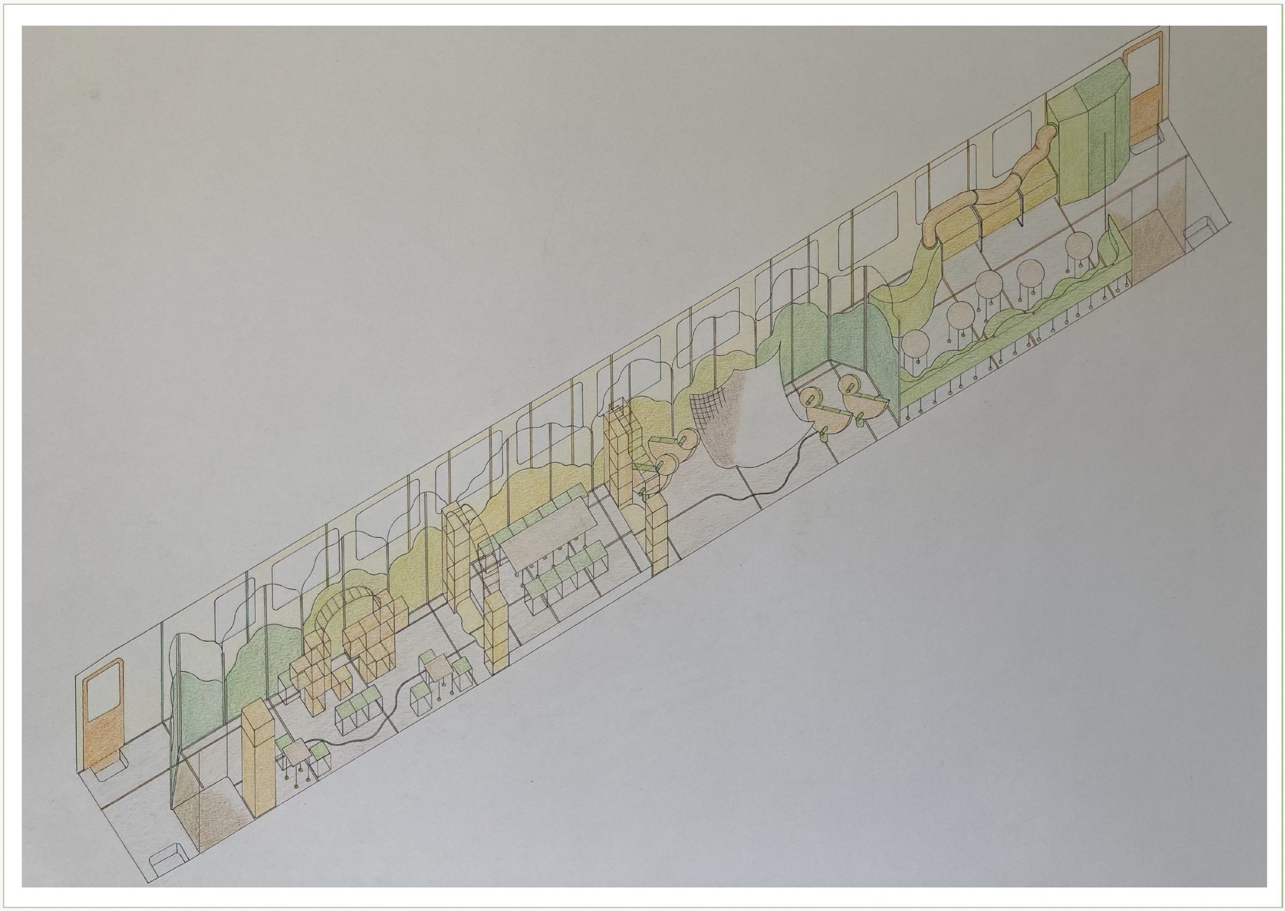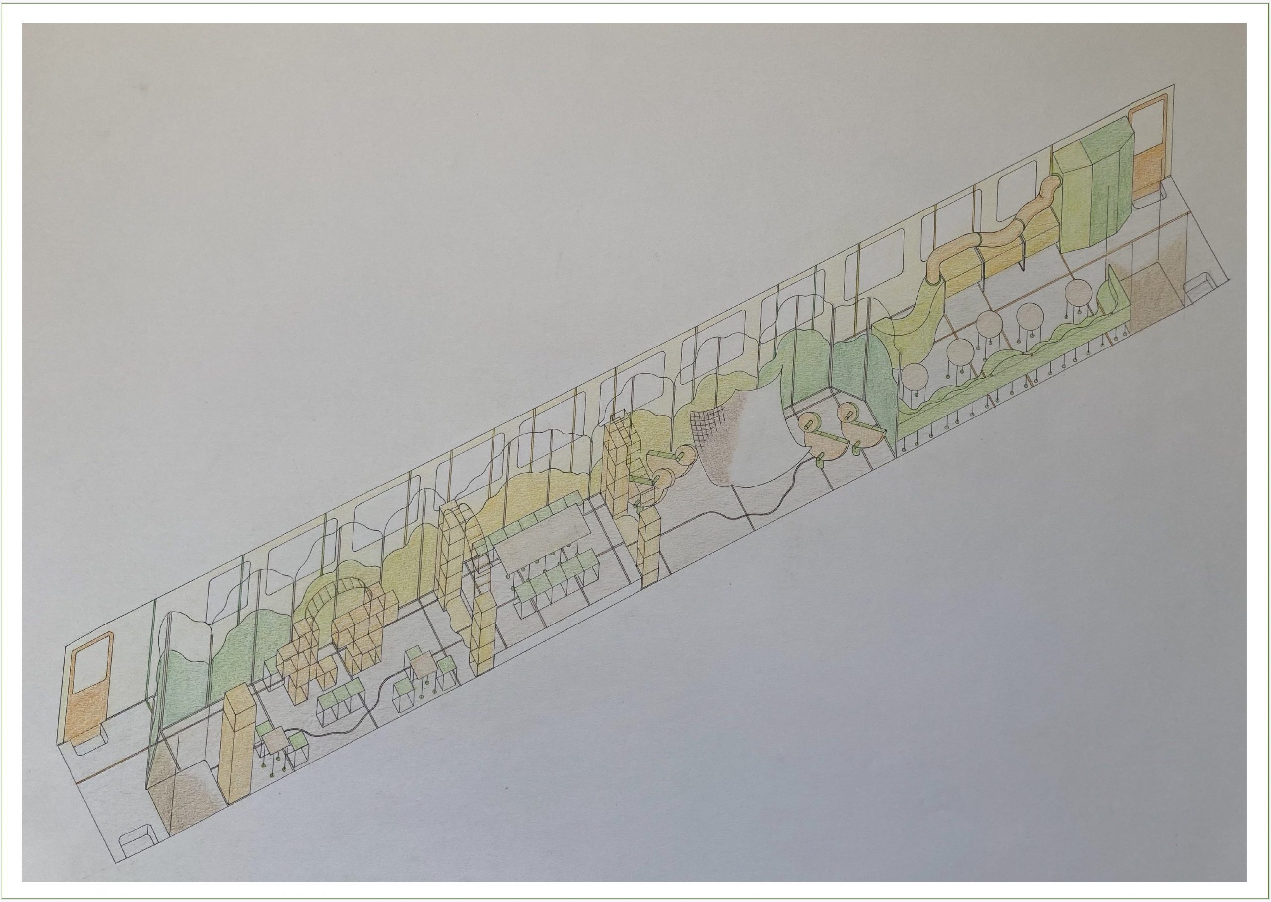 Diplomarbeit – ein Eisenbahnwaggon für Kinder umgestaltet, mit der Option, den Bahnsteig einzubeziehen